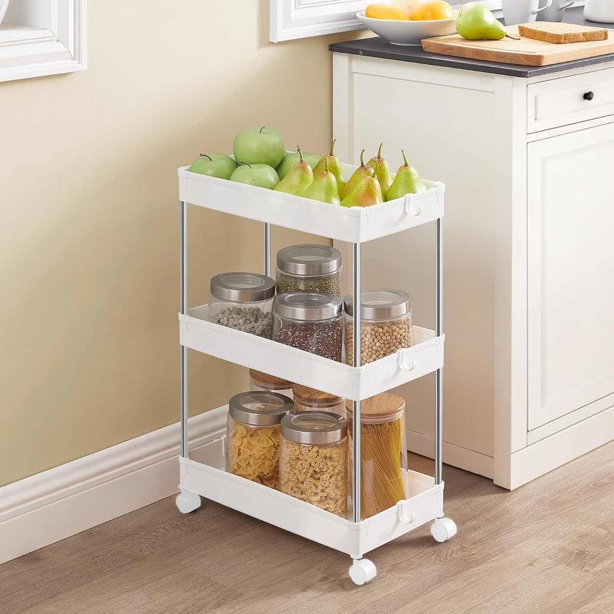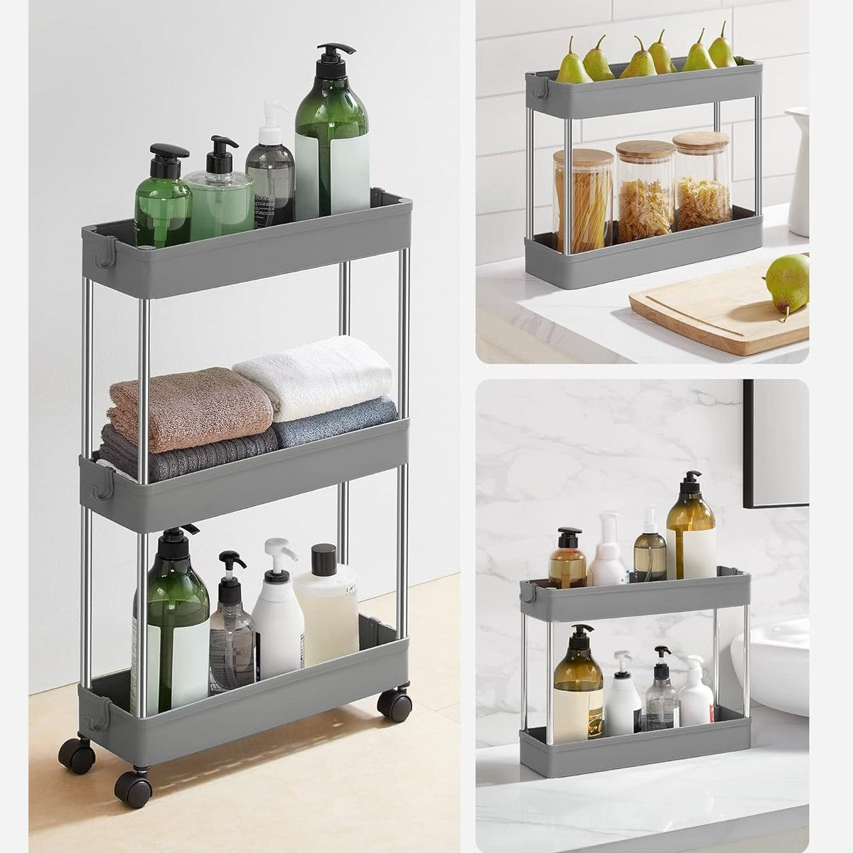 Tämä SONGMICSin kapea 4-tasoinen säilytyskärry muuttaa pienet raot ja käyttämättömät nurkat käteväksi lisäsäilytystilaksi. Vain 12,5 cm leveänä se mahtuu helposti kodinkoneiden väliin, kaappien sivuille tai kylpyhuoneen kalusteiden viereen. Kestävät PP-hyllyt ja vahvat ruostumattomat teräsputket tekevät kärrystä monipuolisen ja tilaa säästävän ratkaisun keittiöön, kylpyhuoneeseen, kodinhoitohuoneeseen tai toimistoon.