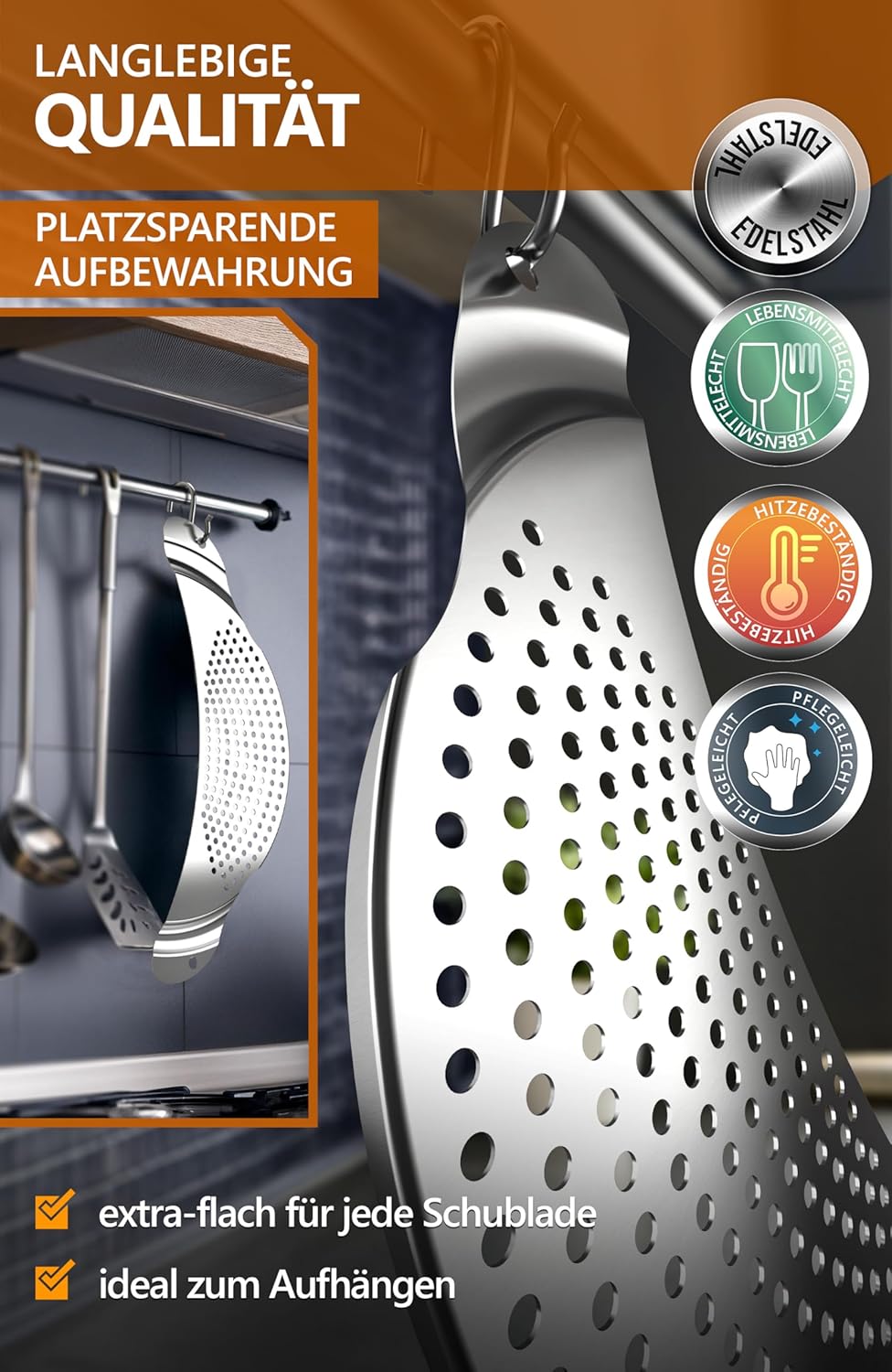 4smile Stainless Steel Pasta Strainer – Flat Space-Saving Pot Sieve for Pots up to 26 cm