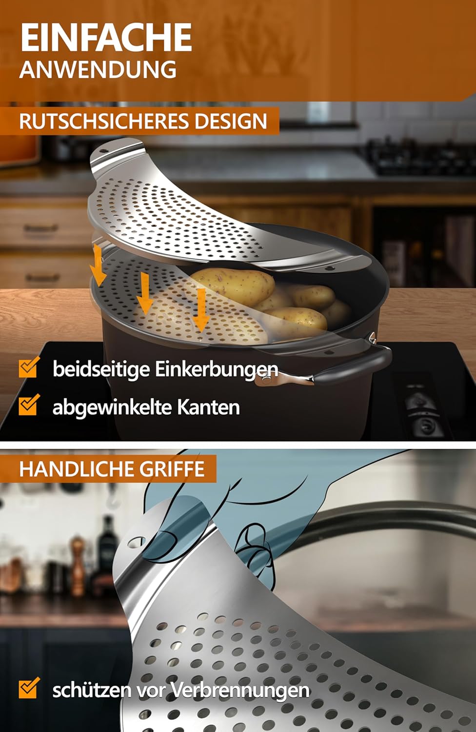 The 4smile stainless steel pasta strainer is a smart, space-saving solution for draining pasta, potatoes and vegetables directly from the pot. Designed as a flat pouring aid, it fits securely onto pots and pans up to 26 cm in diameter, allowing you to drain cooking water safely and efficiently without transferring food to a separate colander. Its compact design makes it ideal for modern kitchens with limited storage space.